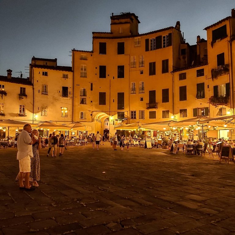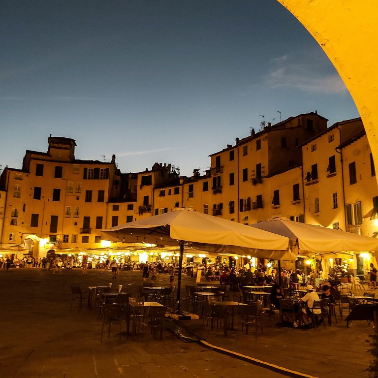 Cudowne miejsce, stare miasto otoczone murem po którego przekroczeniu czujemy się jakbyśmy znaleźli się w zupełnie innej bajce. Przyjechaliśmy o zmroku, ruszyliśmy w poszukiwaniu głównej atrakcji czyli Piazza dell'Anfiteatro. Pora dnia sprawiła, że nasz spacer przerodził się w niesamowitą przygodę. Idąc w kierunku Placu, czuliśmy się jak w opuszczonym mieście duchów. Wiele budynków świeciło pustkami, inne były w trakcie remontu, klimat trochę rodem z horroru. Przez dłuższy czas mieliśmy wrażenie, że błądzimy, ale z uporem maniaka brnęliśmy dalej bez GPS, jak przygoda to przygoda. Wreszcie zaczęli się pojawiać inni ludzie, a markowe sklepy poprowadziły nas do punktu kulminacyjnego naszego wieczoru. Plac okazał się godny naszej wyprawy, można go z łatwością przeoczyć gdyż jest cały otoczony przez kamienice, prowadzą do niego 4 bramy, stoi na pozostałościach po rzymskim amfiteatrze, jego ruiny znajdują się obecnie 3 metry pod ziemią. Plac robi niepowtarzalne wrażenie, mnóstwo kafejek i knajpek, wypełnionych ludźmi celebrującymi wspólnie mijający dzień.