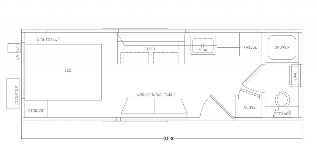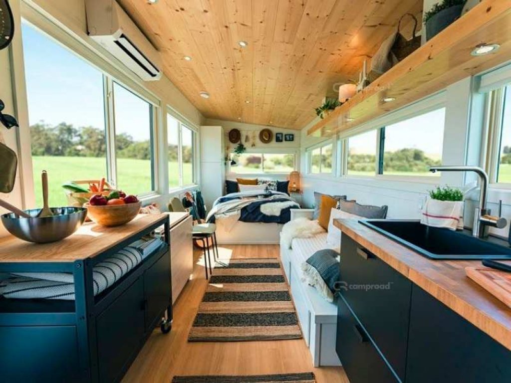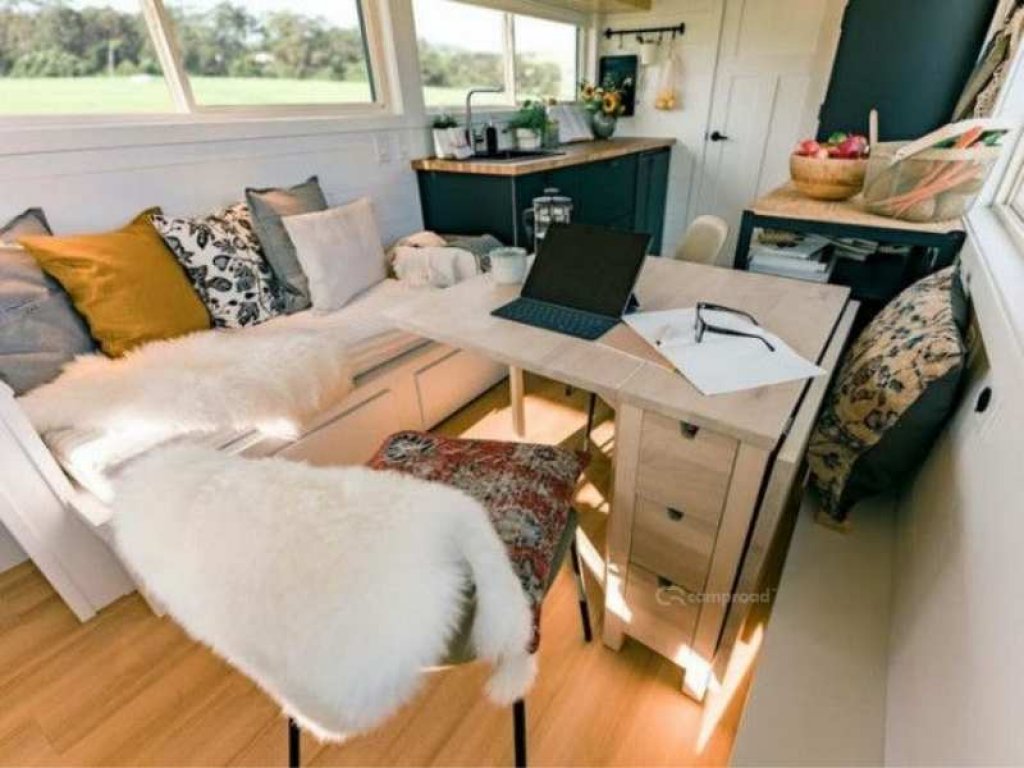 Projektanci wykorzystali małą przestrzeń do przechowywania przedmiotów do maksimum. Przestrzeń w przyczepie wydaje się być większa niż w rzeczywistości. Powierzchnia przyczepy to 17,5m2 W przyczepie zmieszczono łóżko typu queen-size w sypialni, jak i kanapę w salonie. Oba rozwiązania mają wbudowane schowki pod spodem. Stół w salonie może być również biurkiem do pracy mobilnej, ale również masz możliwość aby go całkowicie złożyć i powiększyć przestrzeń.