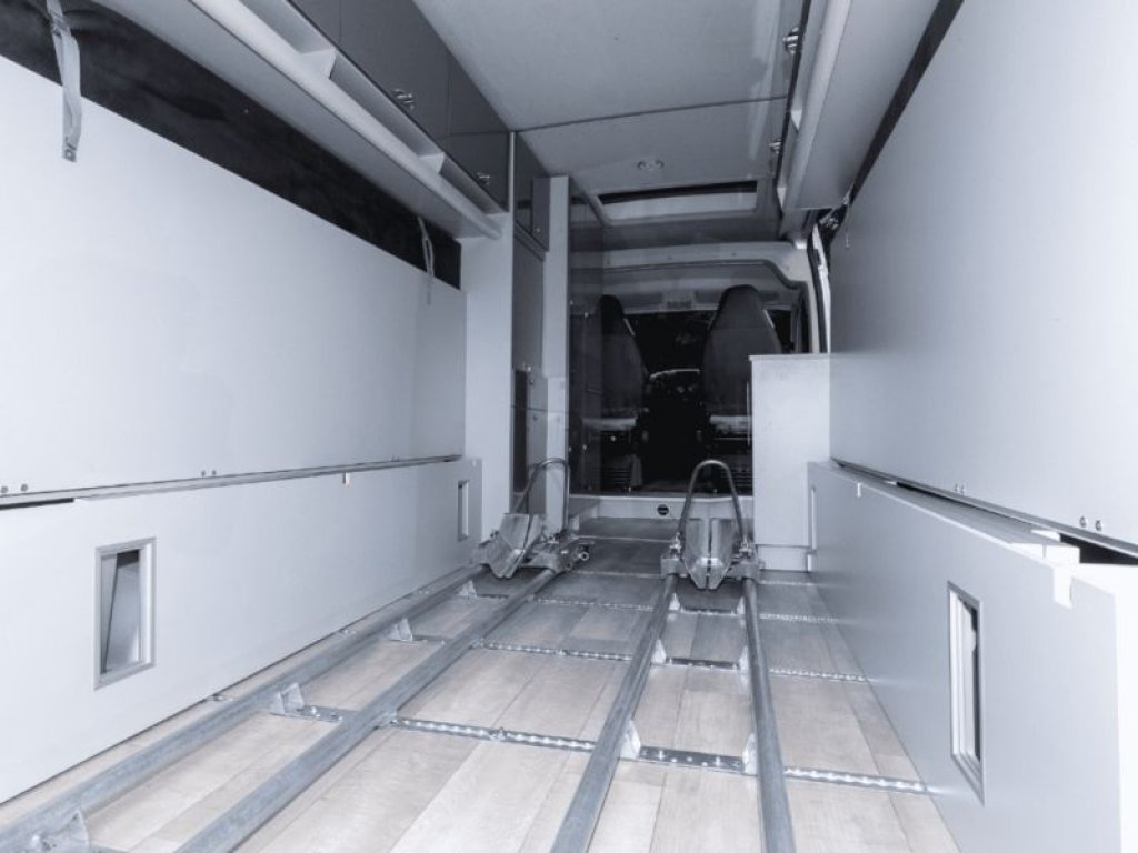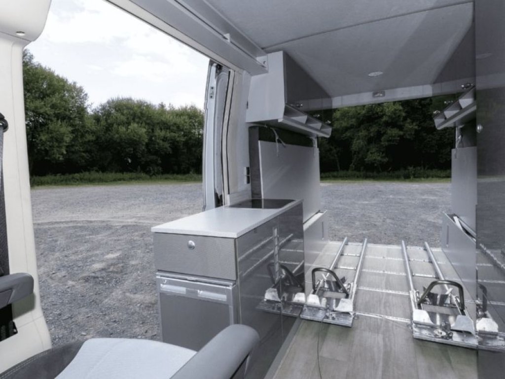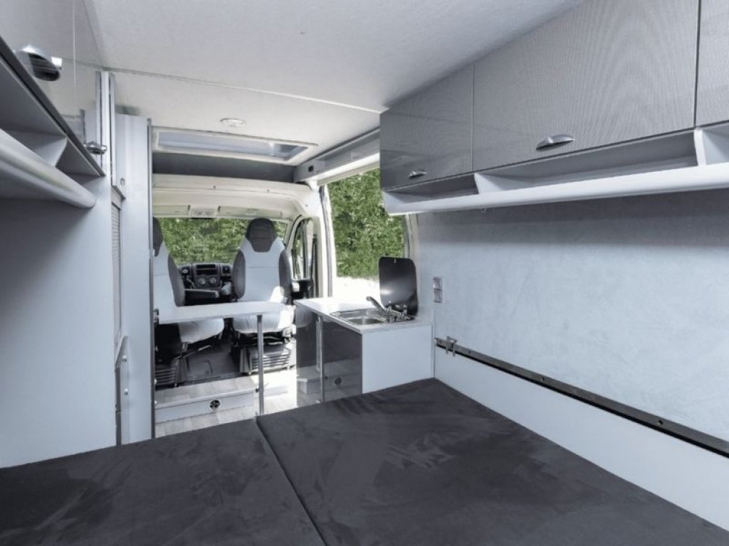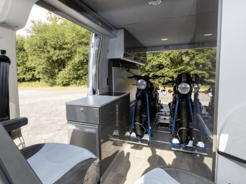 Wygospodarowany moduł do transportu motocykli ogranicza udogodnienia kempingowe w porównaniu z typowymi kamperami o podobnej wielkości, ale nie tak bardzo, jak można by się spodziewać. Biker Solution nie ma łazienki – to pierwsza rzecz która rzuca się w oczy. Znajdziemy tu jednak w pełni funkcjonalny aneks kuchenny z lodówką. Obok mamy część wypoczynkową z wygodnym składanym stołem i obrotowymi fotelami. Moduł do spania znajduje się nad naszą głową znany z takich pojazdów jak VW California. Wejdziemy tam po drabince. To nie znaczy że w kamperze nie ma jeszcze jednego miejsca do spania. Po wyładowaniu motocykli możemy w tylnej części rozłożyć spore łóżko na którym wyśpią się spokojnie 2 dorosłe osoby. Nie bez znaczenia jest duża - bardzo duża ilość schowków i miejsc w których możemy coś schować. Z całą pewnością wiele osób znajdzie dla takiego pojazdu zastosowanie np. przy bardziej profesjonalnych okolicznościach, a mianowicie np. zabezpieczenie techniczne przy amatorskich wyścigach ?