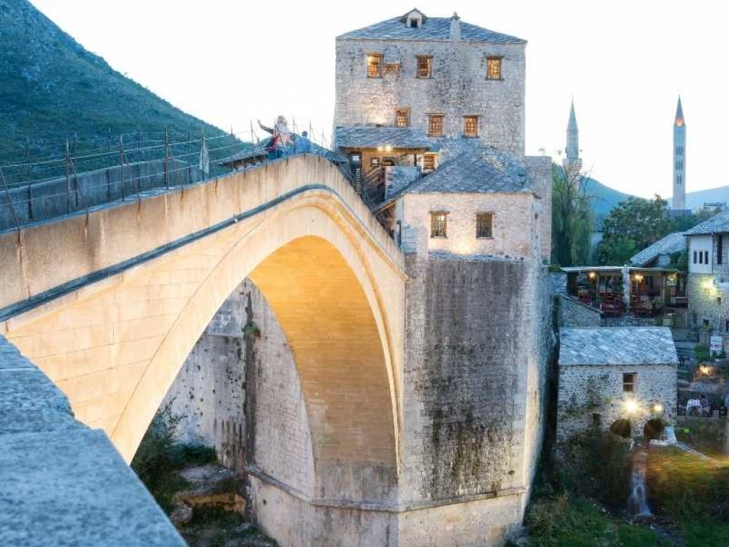 - Mostar - nieziemski widok z Mostaru z mostem nad Neretwą jest jednym z najbardziej znanych miejsc w całym państwie,
