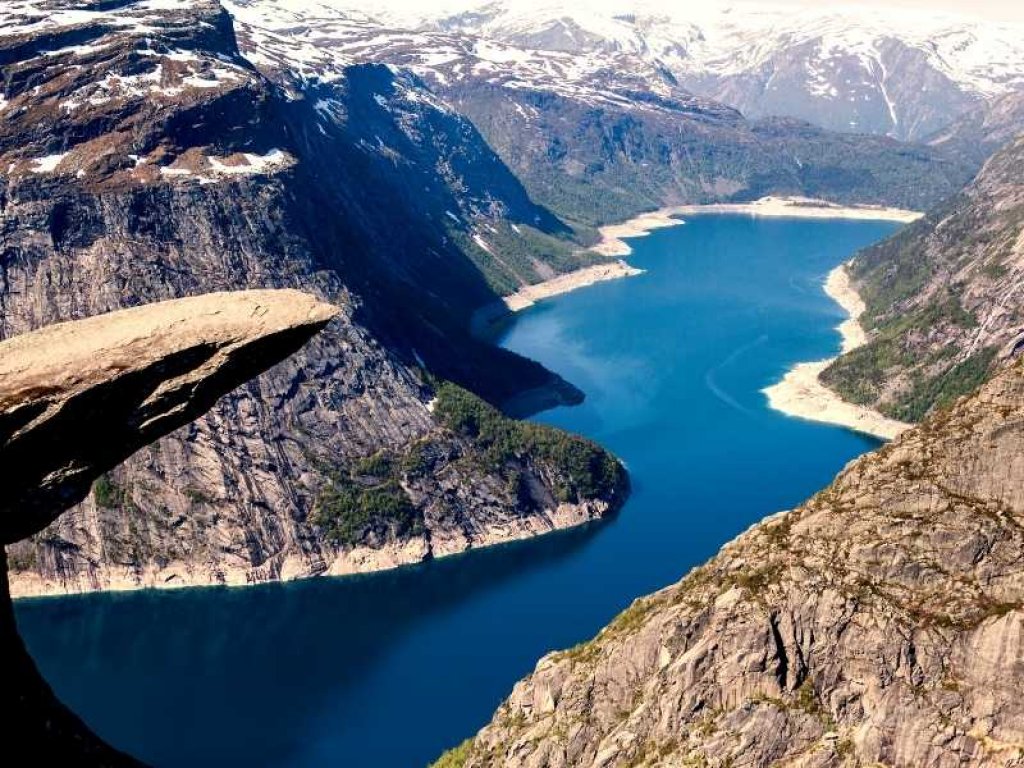 - Trolltunga, czyli dokładnie... język trolla. Z tego wysuniętego ze skał i gór "języka" można podziwiać niesamowite widoki na rzekę i góry. Uwaga : nawet wiosną jest tam zimno i leży śnieg.