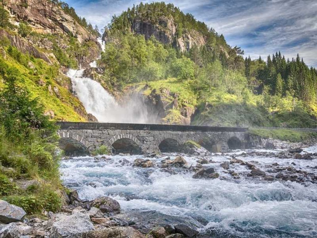 - Wodospad Latefossen, który spływa prosto z gór pokrytych roślinnością.