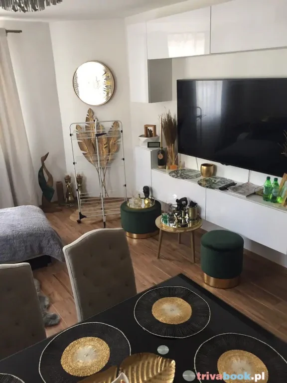 - stołem z 6 krzesłami pięknymi dodatkami dużym telewizorem z pełną kablówką