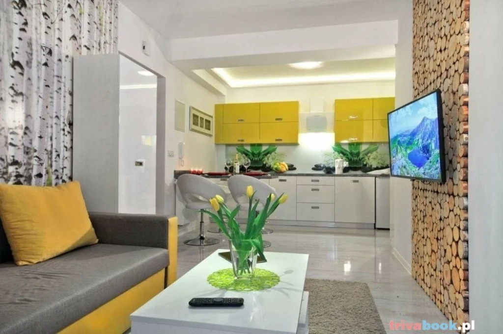 400 m od Krupówek, posiada 2 pokoje, salon z kuchnią i sypialnię.